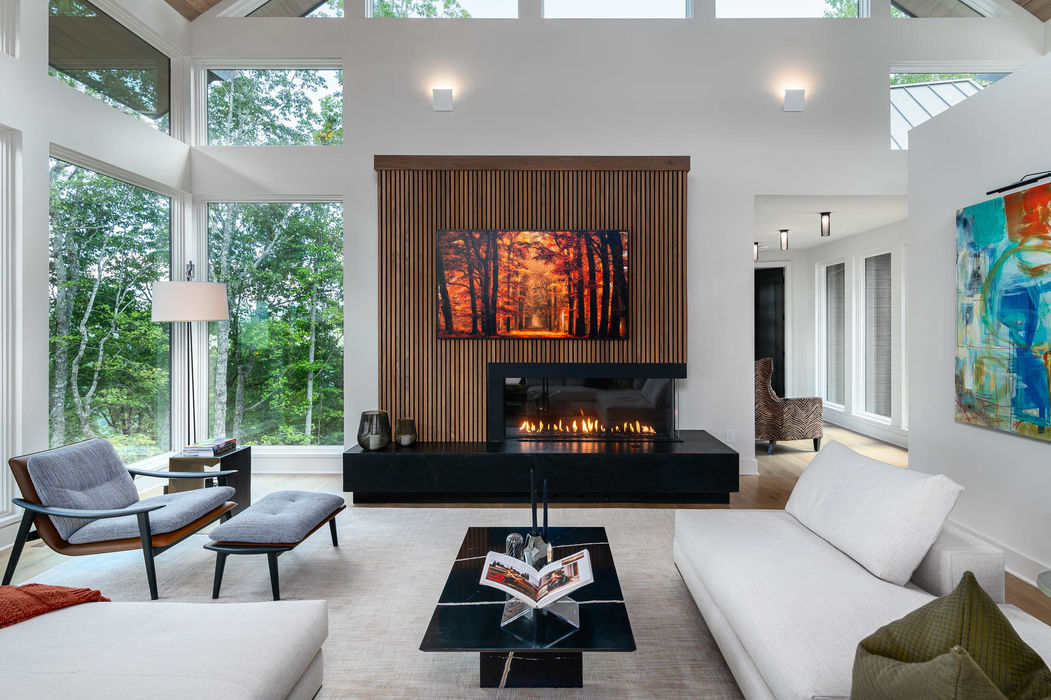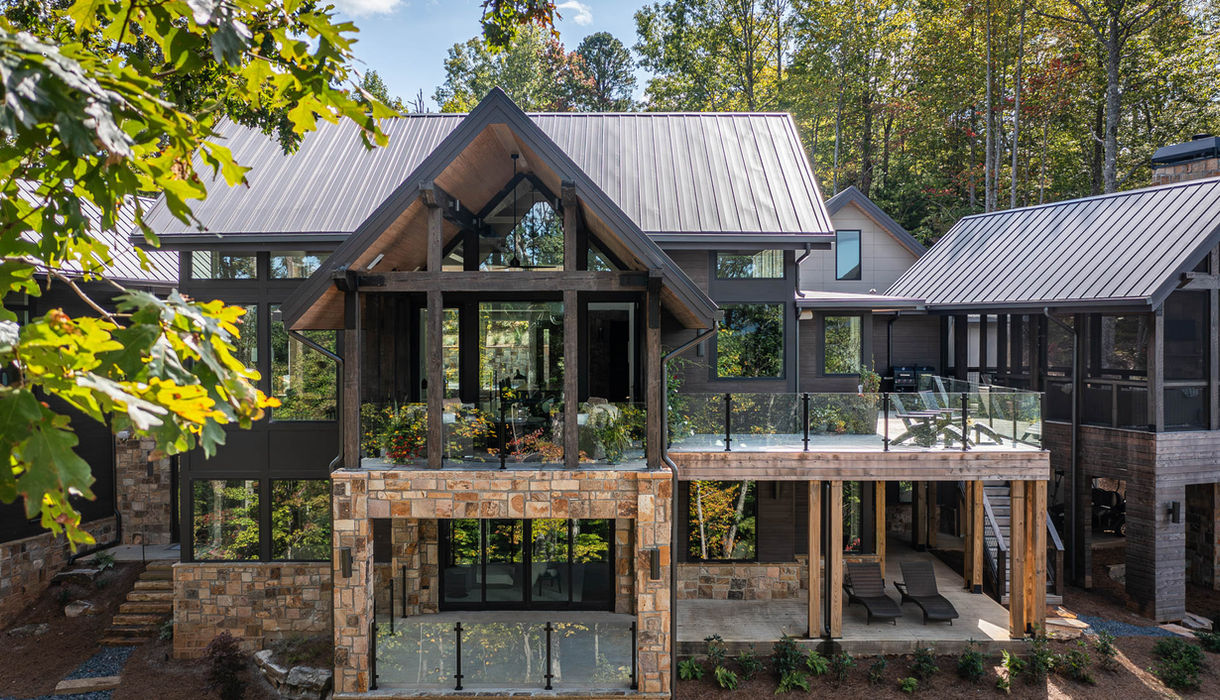 - Jones Pierce has a long-term working relationship with this client, spanning a generation of time over four projects on three homes. Looking back on our journey, from the fantastic view of our current result, we can see an evolved leveling up of how our clients wanted to live in each environment when they chose to make it their own. The clients wanted a location “not too close to the road, and not too far below grade” while embracing the site and taking advantage of views. We needed to find the perfect “flat spot” or as flat as the steeply sloped site could offer. A pre-existing depression at the front of the lot we believed to be an old logging road expressed itself as the natural driveway entrance. In a community of mountain homes with a traditional Appalachian-style leaning – the clients knew they wanted something unique. This required Jones Pierce to be creative with the gray areas of the guidelines and work with the reviewing board early in the design process. As the architects, we wanted to push the design boundaries by introducing dynamic roof lines to create a compound look, sleeker materials, and atypical framing methods that would allow is to develop atypical window openings.