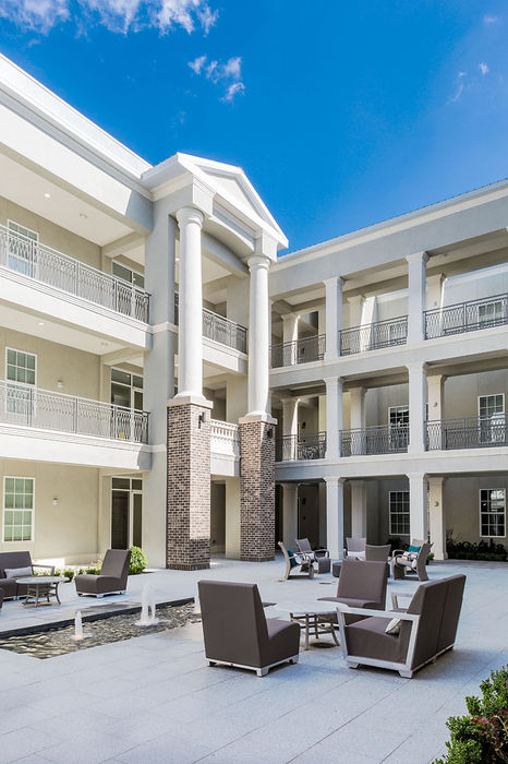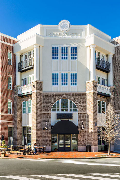 - We designed and constructed a new mixed-use building with retail space and parking on the main level and three levels of condominium units surrounding a central courtyard just off the main square in downtown Alpharetta. The traditional structure helped set the stage for the articulation of the new downtown master plan and provided light-filled and airy units ranging from 2000-4000 sf. The large interior courtyard is ringed by covered exterior walkways and is equipped with planters, a central fountain, a barbecue terrace, and a clubroom. The focus of the project was creating a building to exemplify the preferred architectural style of the Alpharetta development plan. Although it was one large building, we aimed to make the structure appear as a block of smaller buildings using a variety of materials and architectural details. Several requests for larger units were fielded during construction and presale, so units were combined to for larger footprints to result in a total of 33 units.